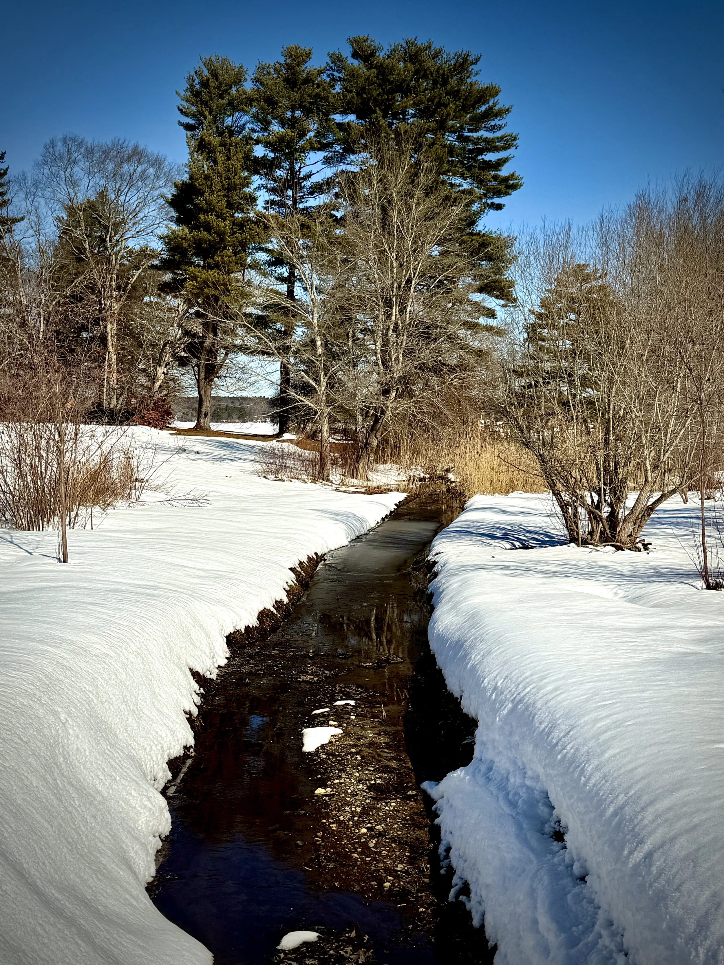 And nearby, the narrow stream moves quietly between its snowbound banks.
